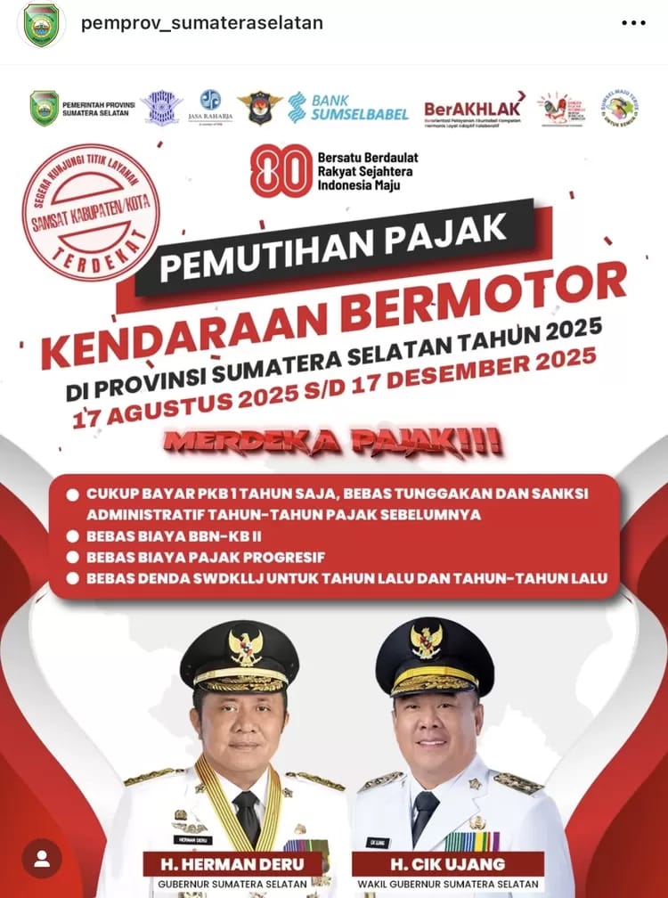 Pemutihan Pajak Kendaraan Sumsel 2025 Berlaku Mulai 17 Agustus -17 Desember 2025 harfaniMaret 17, 2019September 8, 2025111 Dilihat Post Views: 111 Pos terkaitSelamat Kepada Drs. H. Ratu Dewa, M.Si, dan Prima Salam, S.H., M.H, sebagai Wali Kota dan Wakil Wali Kota Palembang periode Tahun 2025-2030Prabowo Resmikan Kantor DPD Gerindra di Banten14 Tahun Terbunuhnya Munir, Polri Didesak Bentuk Tim Khusus2 Hari Hilang, Nelayan Tewas Mengambang di Pantai Cipalawah GarutBersih-bersih, 60 Warga Tanjung Priok Ikuti Program Padat KaryaMenag Kecam Penembakan di New Zealand: Tak Berperikemanusiaan!